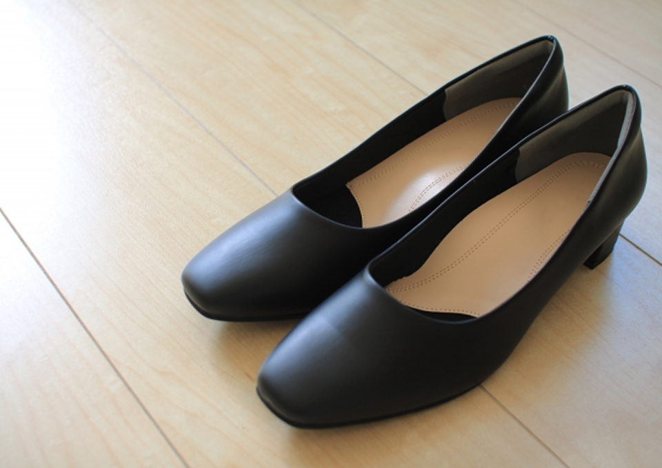女性は甲が覆われる飾りのない黒のパンプスが基本です。かかとの高さは3〜5センチ程度を目安にすると安定して歩きやすく、極端に高いヒールや厚底は避けるのが無難です。つま先が極端に尖っているデザインも長時間の参列では負担になるため控えましょう。